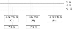 1553B总线网络由终端、子系统和总线传输介质组成,结构如图1所示。终端是使数据总线与子系统相连接的电子组件。子系统为从多路数据总线上接收数据传输服务的装置或功能单元。总线控制器(BC)是总线系统组织信息传输的终端。总线监控器(BM)是总线系统中指定作接收且记录总线上传输的信息并有选择地提取信息以备后用的终端。远程终端(RT)是总线系统中不作为总线控制器或总线监控器的所有终端。