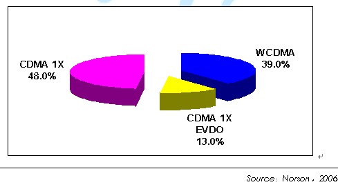 截至2006年2月底,全球使用CDMA20001X和WCDMA等3G技术的用户已经达到了2.3亿人,已经占到全球移动用户的10%。其中CDMA20001X用户1.57亿人、EV-DO用户2400万人、WCDMA用户4910万人。其中,CDMA1X的用户发展已经进入平稳期,依旧占据着大部分的市场份额,但是所占比例在逐步缩小,而WCDMA和CDMA1X EV-DO用户发展较快,所占的比例也在逐步提高。
