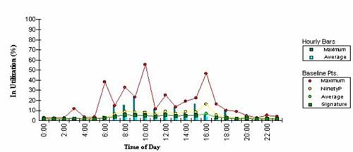 利用率问题包含两方面。第一,要确定工作站什么时候确实处于使用之中几乎是不可能的。即使有一个人坐在办公桌前,他也许在打电话,并没有使用网络。第二,许多用户在本地工作,他们在完成工作之后把他们的工作存储在网络上。因此,在使用中, 你必须知道这个网络什么时候在真正地使用以确定正在消耗的带宽有多少。例如,参考下面的两个图表: