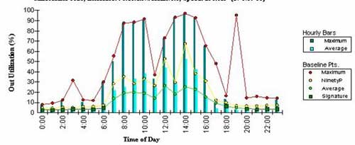 在上面的图1中,网络使用情况是根据一个星期的入网的通信获得的测量结果。图2显示了同一条线路一个月的测量结果。正如你看到的那样,使用情况有很大的差别。当你规划VoIP的时候,你应该假设通信量一直处于高峰状态。如果不是这样的话,当处理任务加重的时候,由于你的计划没有做这种准备,你的语音信号质量就会下降。