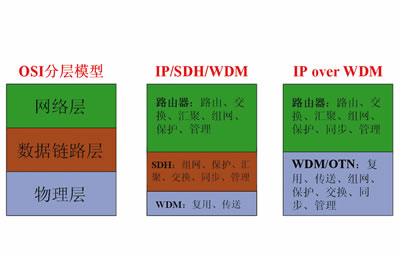 图1从OSI分层模型角度描述了各层的功能定位。与IP over SDH(ASON)相比,IP over WDM省去了SDH层面,减少了重叠功能,节约了SDH设备投资和相应的维护成本,在经济性方面具有一定的优势。然而,随着SDH层网络的逐渐被边缘化,其核心功能能否由IP层和WDM层分担,取决于业务需求和技术发展。