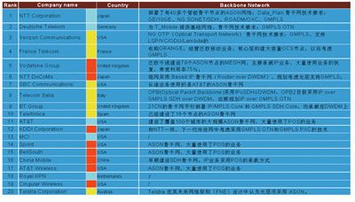 目前,几乎所有大的电信运营商都拥有SDH网络。据不完全统计,在排名前20的运营商中有11家引入了ASON骨干网,有5家引入了IP over WDM网络,并准备向IPover OTN方向演进,具体如表1所示。