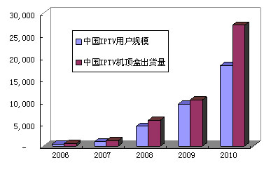 图二:中国IPTV用户规模和机顶盒出货量的比较(2006-2010) 单位(千)