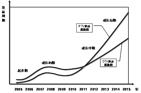 图三:IPTV和DTV的发展路图比较 (2005-2015)
