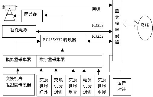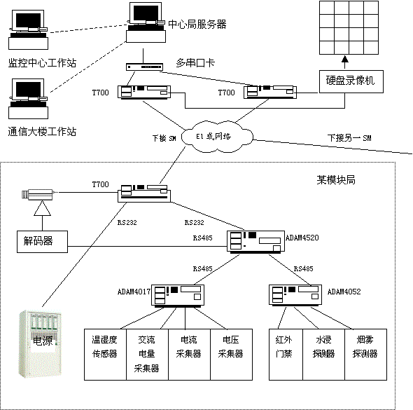 智能设备利用RS-232接口接至监控单元微机串口,通过软件的协议转换,采集智能设备的各种数据,通过局域网采集的数据送至监控中心微机的多串口卡。