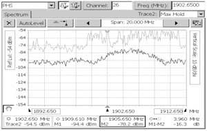 接到干扰申诉后,监测站技术人员立即进行了分析研究。由于PHS无线系统的工作频段为1900~1915 MHz,而监测车及固定站的测向工作频率为20~1300 MHz,因此,无法利用固定站及监测车查找干扰源。在询问了电信公司技术人员有关干扰情况后,我们决定,利用泰克YBT250测试仪和相应频段的八木定向天线到以下几个受干扰比较严重的基站处进行实地测试:党校路12号、护堤路220号、金新路79号、福利院和潮汕路电信大楼。我们首先来到护堤路220号,关闭该处的PHS基站,在天台上进行测试。我们选择的是YBT250中的PHS制式并预设仪表,天线采用垂直极化,对1900.00~1920.00 MHz频段进行监测,这时发现了一个中心频率为1905.650 MHz,带宽约为7 MHz的信号(见图1)。仪器上显示的信号强度随着八木天线指向不同而变化,技术人员记下了信号强度最大时八木天线的指向。