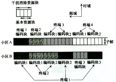新方法基于编码块分割的原理,如图3所示。对于需要占用更大带宽的终端,可以将这个终端的数据分成若干个独立编码块分别编码,每个编码块正好占用一个ICRB。一个终端占用的资源可以分配到相邻的ICRB中(如图3中小区A的终端3),也可以分配到分散的ICRB中(如图3中小区B的终端1)。应该适当地选择ICRB的大小,如果ICRB的尺寸过大,则只有很小一部分终端可以采用ICI消除技术。如果ICRB的尺寸过小,则可能由于编码块过短,造成信道编码增益的显著损失。