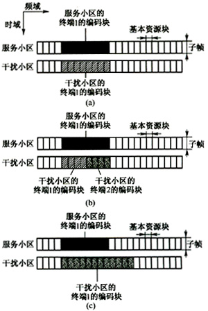 图1包括了3种资源块分配的情况。第1种情况下,干扰小区中的一个编码块和被干扰小区的一个编码块正好重叠,如图1(a)所示,此时ICI干扰消除可以采用简单的“双用户检测”法。在第2种情况下,被干扰小区中的一个编码块和干扰小区的2个编码块重叠,如图1(b)所示,此时虽然仍可以进行ICI干扰消除,但必须要采用相对复杂的“3用户检测”法。在第3种情况下,被干扰小区中的一个编码块只对应于干扰小区的一个不完全的编码块,如图1(c)所示,此时由于干扰信号无法被正确解码,因此无法采用ICI消除。