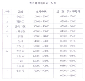 对900 MHz无中心系统的管理,主要是对电台呼号编码的管理,包括电台地址码的编制分配以及对具体电台呼号的指配。根据信无函[2005]53号文的规定,各地无线电管理机构可根据本地实际情况自行分配电台地址码,指配电台呼号。为了便于对电台呼号的识别和管理,在实际工作中,我们按照本地行政区划的特点,对电台地址码进行了细分。下面以辽宁省大连市为例,介绍电台地址码的具体分配方案(见表2)。