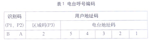 900 MHz无中心系统的电台呼号编码,由两个英文字母和紧接字母的六位数字组成,如BA-2-54321。前两位字母为识别码,如辽宁省的识别码为BA;第三位数字表示区域,称为区域码,其范围为0~F,可分为16个区域,由省级无线电管理机构自行规划和分配,如大连市的区域码是2。第四位至第八位的5位数字表示电台地址码,范围为00000~99999,共十万个。区域码加上电台地址码统称为用户地址码。识别码加上用户地址码构成了用户电台呼号编码(如表1所示)。