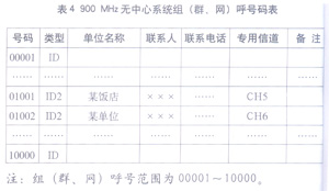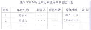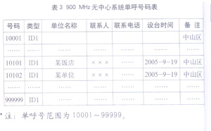 对900 MHz无中心系统的用户电台呼号进行管理,主要是对单呼号、组(群、网)呼号以及用户单位信息的管理,这些工作可通过运用以下三张表格来完成:900 MHz无中心系统单呼号码表,组(群、网)呼号码表,用户单位统计表(见表3、表4、表5)。例如,大连某饭店申请30个单呼号码、1个组呼号码,我们为其指配的单呼号码范围为10101~10130,组呼号码为01001,并为组呼号码设定专用信道Ch5。
