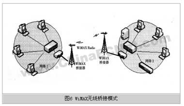 如图6所示,无线桥接模式是一种点到点无线链接方式,与远程网桥的作用相似,其目的是把地理位置分离的两个子网络通过WiMAX无线链路连接在一起。由于无线桥接采用点对点方式,两端WiMAX无线网桥设备天线的方向可以彼此对准固定,因此传输性能相对稳定,部署也相对简单。