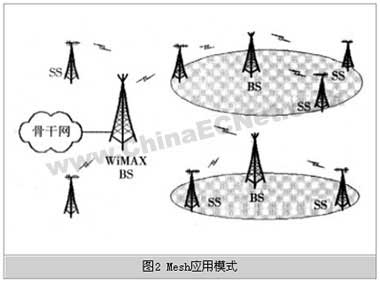 WiMAX接入网络可根据实际情况灵活采用PMP或Mesh结构形式。对于移动运营商也可以采用该应用模式,把各小区移动基站业务回传到移动交换中心。