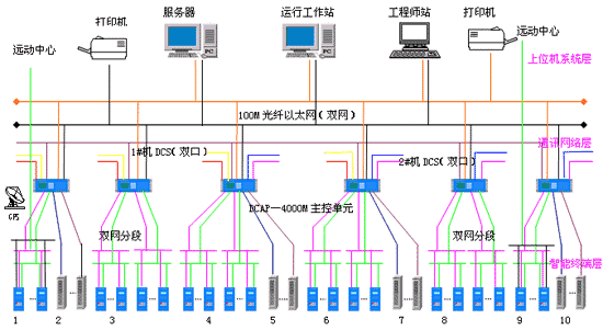 现场总线分别将厂用6KV和400V系统相连,并通过DCAP—4000M主控单元与DCS系统相联,每个通讯单元对测控保护层的通讯规约可以不同,但对DCS系统的通讯规约相同。图中励磁调节装置、发变组保护也可直接用其内部通讯接口,不需要额外的通讯单元。