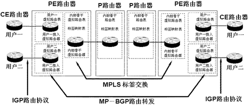 当属于某一VPN用户端路由器(CE)有数据进入时,在CE与PE连接的接口上可以识别出该CE属于哪一个VPN,进而到该VPN的VRF路由表中去读取下一跳的地址信息,同时,在前传的数据包中打上VPN标记(内层标签)。下一跳地址为与该PE作Peer的PE的地址,为了到达这个目的端的PE,在起始端PE中需读取MPLS骨干网络的路由信息,从而得到下一个P路由器的地址,同时采用LDP在用户前传数据包中打上用于MPLS标签交换的标签(外层标签)。