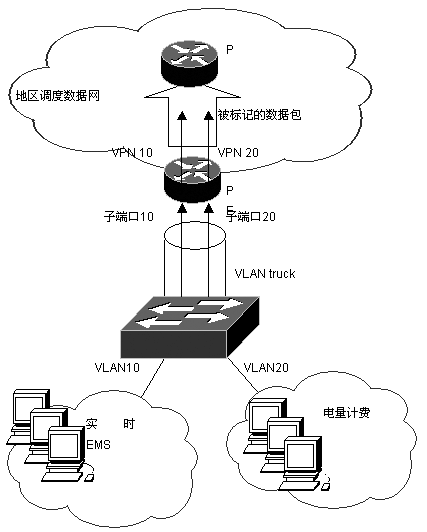 网络中的路由器,可能是骨干路由器或核心路由器,负责MPLS VPN用户(应用)的接入,即PE路由器。PE路由器与交换机之间以VLAN truck连接。在PE路由器的连接端口上,划分了与各个VLAN对应的子端口,如与VLAN10对应的子端口10,与VLAN20对应的子端口20。实时EMS和电量计费的数据通过交换机的VLAN10和VLAN20和VLAN truck,分别流出到PE路由器上的子端口10和20。由于这两个子端口都配置了MPLS VPN属性,分属于VPN10和VPN20,所以流入的数据就被分别导入到各自的VPN中。然后,PE路由器将根据各自VPN的VRF路由表加入VPN标识符后,再通过MPLS标签转发的方式将数据进行传输。如果使用VPN的应用对网络性能有特殊要求,可以分别在各自的VPN中设置。
