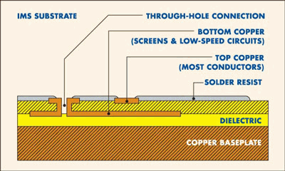 即使假设通过采用提高效率的方式(例如直流/直流转换器常用的方式)可以达到高于平均值的效率,我们的输出率和效率目标也表明原型设计必须在全负载时能够散发高达100瓦的热量。通过以热耦合方式耦合至散热片或其它散热表面,可以有效地将原型产品基板上的热量散去。这里的问题是如何将组件的热量通过印刷电路板转移至基板。特别要注意的是,很明显使用传统的FR4 印刷电路板材料无法满足散热要求。但是另一种选择,绝缘金属基板(IMS)技术(铜箔轨和金属基板间夹有一个薄薄的电介质层,如图4所示)却能提供一种满足散热要求的方法。