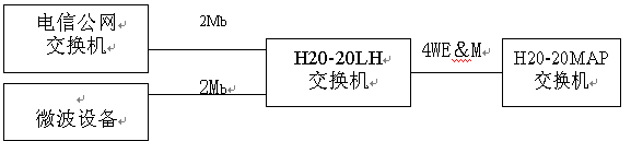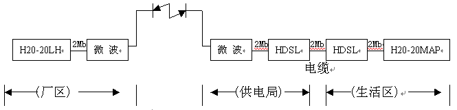 厂区H20-20LH交换机通过2Mbit/s数字中继单元(DTU)用同轴电缆与微波2Mbit/s通道相连,淮北供电局微波站2Mbit/s接入HDSL的2Mbit/s接口,然后通过音频铜缆与生活区HDSL设备相连,H20-20MAP交换机通过2Mbit/s数字中继单元(DTU)用同轴电缆与HDSL设备的2Mbit/s信号连接即可。此种方案的优点是节省了光缆费用,直接利用了已有的通信资源,维护较为方便,出现故障能够快速判断出故障位置。此种方案需在生活区购置交换机、通信电源蓄电池、音频配线架等设备。