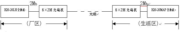 厂区H20-20LH交换机通过2Mb/s数字中继单元(DTU)用同轴电缆与厂区光端机相连上光缆,在市招商大厦处分离两芯光缆接至生活区光端机,H20-20MAP交换机也通过2Mb/s数字中继单元(DTU)用同轴电缆与光端机连接即可。此种方案的优点是设备较少,设备维护起来较为方便,缺点是光缆维护较困难,一旦招商大厦处光缆开路有故障,将十分麻烦。在生活区需要购置交换机、通信电源蓄电池、音频配线架以及光纤终端盒等设备。
