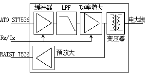 在发送模式下,电力线接口把来自ST7536芯片ATO的发送信号进行放大和滤波。缓冲区的作用是保护ST7536,并且驱动电力线接口中的下一个部件。低通滤波器(LPF)的作用是抑制谐波。滤波后的信号被送入功率放大器,这个功率放大器通过转换器来驱动阻抗为1~100Ω的电力线。此外,放大器也进行频段滤波,来抑制发送信号的二次谐波。