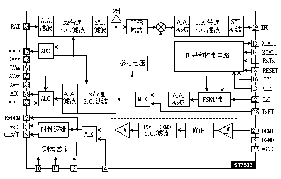 为了调试芯片,测试外部电路,ST7536提供了几个测试选项。用发送频段滤波器上的一个直接输入就可以观察发送频段滤波器的工作情况。如果TEST4=1,那么多路开关就选择这个发送滤波器输入(TxFI)。接收频段滤波器在25引脚输出。最后,TEST1=1时可以观察到时钟恢复的情况,这时TEST3输入直接作为时钟恢复模块的输入。
