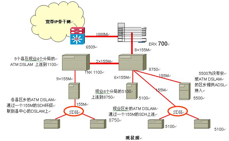1. ××分公司主要以ATM DSLAM为主,17个局向分别通过17条155M上连到TNX1100和8750 ATM交换机上,见表一。再由8750以8条155M中继和ERX相连。