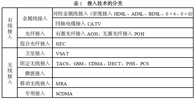 (2)接入技术的选用 由于接入网涉及现有的窄带业务和未来的宽带业务以及相关的业务网络, 因此它将成为近年来包括交换、传输、管理及计算机等各种通信新技术发展的综合体现。接入网可采用空分复用( SDM)、时分复用( TDM)的双向技术以及空分多址( SDMA)、时分多址( TDMA)、频分多址( FDMA)、码分多址(CDMA)等多址技术。接入技术分为有线接入、无线接入两大类。具体内容见表1 。