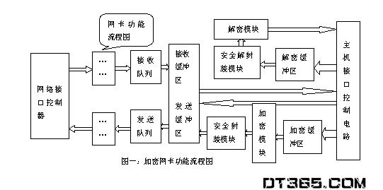 我们在网卡原有的功能结构基础上,增加加密模块、解密模块、封装模块、解封装模块,加密缓冲区、解密缓冲区。并且为加密模块、解密模块、封装模块、解封装模块设置输入数据线、输出数据线以及控制线。加密网卡的功能流程图如图一。