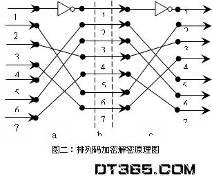 (图二)所示为排列码加密解密原理示意图,它的加密强度比世界最先进的DES高 105781 多倍;加密速度极快,仅几级门电路的延迟。本算法采用Maxplus设计此算法的专门功能部件来提高算法的加密速度。加密模块采用ALTERA 公司的MAX7000B系列产品 EPM7256BQC208-5。