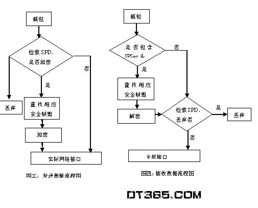 当主机发送数据时,由驱动程序控制询问SPD,判断是否加密或丢弃,如果丢弃,则直接丢弃;如果加密,则送到加密缓冲区,进行加密,当安全封装完,就送到发送缓冲区;不加密则直接送到发送缓冲区,进行网卡发送数据的工作。