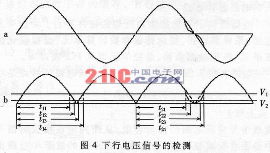 图4(a)表示的下行电压信号的bit"0",两个周期表示一位,调制信号叠加在第二个周期电压过零点附近。若调制信号叠回在第一个周期,则表示下行电压信号的bit“1”。为了检测信号的方便,将图4(a)波形全波整流得到图4(b)波形。图4(b)中高有两个比较电平V1和V2,通过单片机的定时器分别测得比较电平对应时间量t11,t12,t13,t14,t21,t22,t23,t24,令Δt=(t21-t11+t22-t12)+(t13-t23+t14-t24),不考虑噪声及电网频率的变化,当电网中没有工频通信调制信号时,Δt的值为零,反之,存在调制信号,同时可以根据Δt的正负来判断所接收到的信号是“0”还是“1”。这种方法,算法简单,硬件实话容易,对于电网干扰较小的居民应用是可行的。但电网频率的波动、家用电器的干扰、检测系统时间基准的变化等很容易影响接收数据判断的正确性,则需要采用后面所述的抗干扰措施。