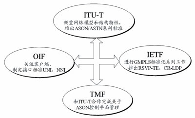 2000年前后,许多国际标准化组织和论坛(如ITU-T、IETF、OIF和TMF等)纷纷着手ASON标准化的研究。截至目前,已有大量的有关ASON的标准草案面世,如ITU-T的G.8080、G.8081和G.771x系列;IETF的GMPLS协议族;OIF的UNI1.0、UNI2.0和ENNI信令和路由等。这些标准化组织的目标是制定一个开放式的通用智能化光网络模型以及相关的标准接口、自动交换和动态配置控制协议,便于不同厂商的设备在光网络中互联互通。ITU-T、IETF和OIF之间工作具有很强的互补性。图1为ASON标准化组织的不同侧重点和相互的关系。