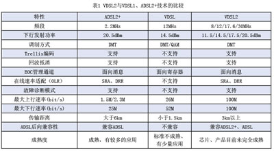 VDSL2与VDSL1、ADSL2+技术的比较如表1所示。