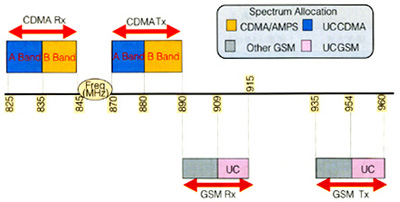 中国联通的CDMA和GSM基站的频谱分配如图1所示。