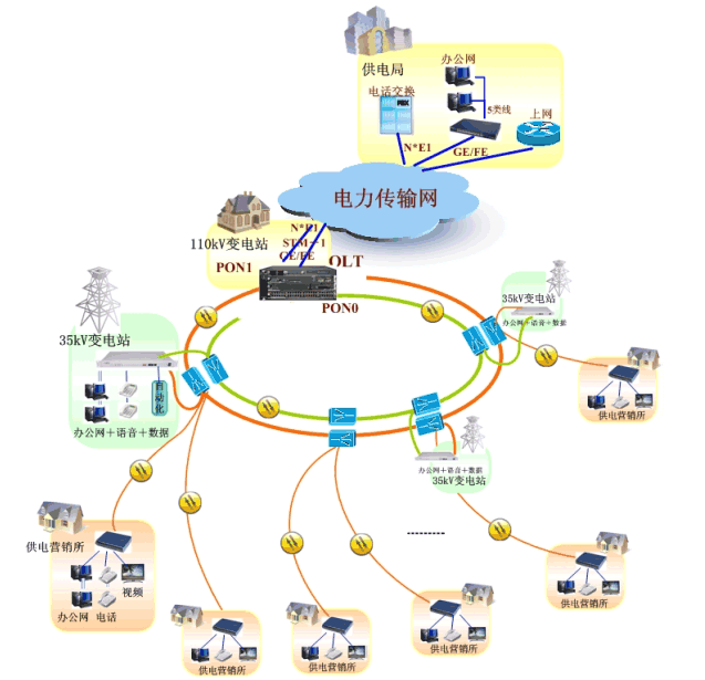 随着农网改造项目的不断深入,供电所到供电局的营销网络建设已提到议事日程。由于目前电力农网通信建设发展的不平衡,视资源情况,对于35KV调度网已采用光纤铺设的地区,采用供电所就近拉光纤至附近变电站,借助已有的光纤调度网资源,组建营销网络,实现供电营销所到供电局的网络互连。