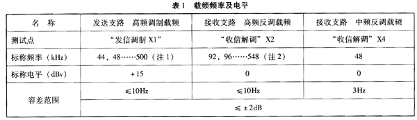 用频率计和选频电平表高阻抗跨测各载频频率及电平、测试点、标称值和容差范围见表1。