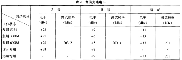 用选频电平表在方向发送单元前端的测试点X选测外线话音、导频电平,在各种复用、专用状态下,各信号电平及频率见表2;
