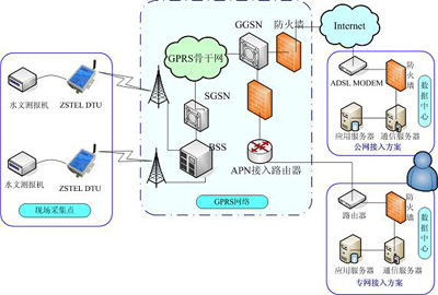 各水文监测点使用成都众山科技有限公司的ZSD3120GPRSDTU透明数据传输终端,通过移动GPRS网络与监控中心相连。各水文监测点的GPRSDTU使用移动通信公司的GPRS普通数据卡或APN专用数据卡,同时监控中心对各点GPRS终端编号进行登记, 并与采集点信息进行关联,以便识别和维护处理。信息采集中心运行监控系统软件,实时采集水文信息数据。