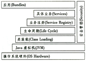 图1为OSGI的系统结构层次图。图中的Bundle是该环境中的基于Java的应用,它包含Java类和向最终用户提供功能的其他资源,即功能业务的子体。向其他Bundle提供服务的部件,称为Service服务。Service是实现了特定接口的Java对象。OSGI框架的注册功能用于在Bundle之间交换Service服务,它提供了家庭网络业务所需的安全性和受控性。通过这种注册机制,Bundle可以向其他Bundle提供服务,同时也可以使用其他Bundle的服务。注册机制是有安全性保护的。Java环境提供了所需要的平台无关性、可靠性和安全特性。