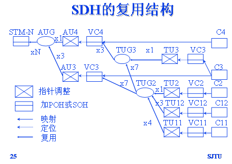 复用: 按单字节间插方法,将N个TU变成TUG,N个AU复接成AUG,N个AUG复用进STM-N的过程