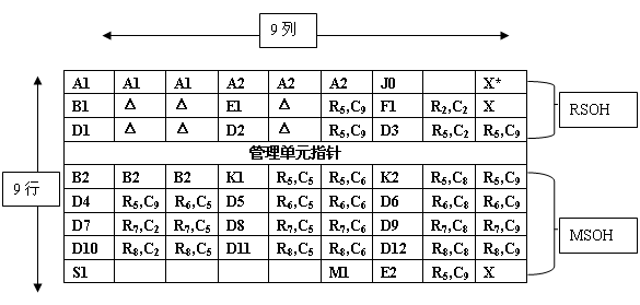 STM-1的基本帧结构,以字节为单位排列,9行x270列为一帧,其中最左面9行x9列为SOH(段开销)及PTR(Pointer-指针)部分,其余9行x261列为净负荷(Payoad).