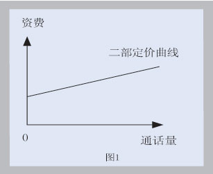 二部资费(Two-partPricing)是非形性资费的一种,是指分两部分收费,其根据成本分为固定成本和边际成本两部分,将价格分为反映基础设施投入的固定成本以及其他流量不敏感部分的成本和反映单位(流量敏感)成本、也就是每提供一个产品或服务的边际费用。这种资费模式在世界电信业内实行得最为广泛和长久,一般表现为“月租费+通话费”的形式,月租费反映固定成本以及其它流量不敏感成本,计次或计时费用反映按照实际通信量计付的可变成本。简言之,二部资费中既包括一笔和消费量无关的固定费用,又包括一笔按消费量计算的“从量费”,如图1所示。