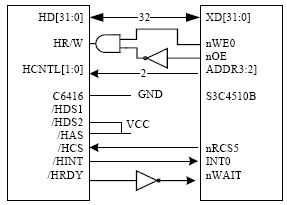 DSP与微控制器的接口是通过C6416的主机接口HPI32实现的,为了确保数据吞吐量,使用32位总线,C6416的主机接口和PCI总线引脚共用,设置PCI_EN=0,配置为HPI模式。这样做的优点是充分利用DSP的带宽资源,减少总线上的冲突,减轻EMIF总线压力。因为DSP为高速器件,S3C4510B为低速器件,接口DSP采用异步从模式,即DSP(slave),S3C4510B(master),这样DSP工作在从模式下,无须加入共享存储器模块,节省了开发的成本,同时也降低了开发的难度,其他相关控制信号线连接如图3。