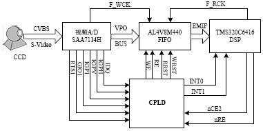 该模块的主要功能是将从CCD摄像头输入的模拟视频信号转换为数字信号。如图4所示,普通CCD摄像头的输出是NTSC制式(或PAL制式)的复合全电视信号CVBS或是S-Video信号,二者均为模拟信号。通过Philips公司的TV解码芯片SAA7114H将模拟TV信号解码并且模数转换为符合CCIR.601标准的数字视频信号,并且存储到AVERLOGIC(凌泰)专用的视频帧FIFO芯片AL4V8M440(8Mb)中,等待DSP处理。帧FIFO配置在C6416的CE2空间,CPLD通过SAA7114H的输出状态信号以及C6416DSP的相应输出控制信号生成FIFOAL4V8M440的控制信号。通过检测SAA7114H输出的同步信号来生成DSP中断,通知DSP读取视频FIFO中已满的一场图像数据。