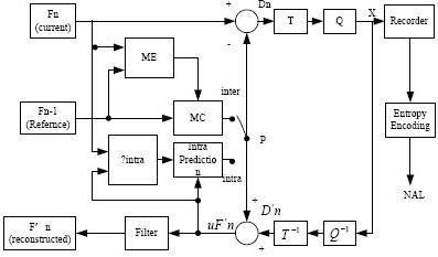 输入帧Fn经过宏块(MC)处理后,根据是在帧间还是帧内预测编码模式,分别确定预测值(P):在帧内模式,P值由前面经过编码、译码和重建的分片uF'n决定;在帧间模式,P值由帧间的运动补偿预测决定。