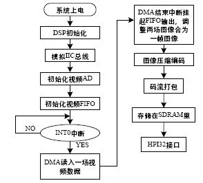 TMS320C6416是德州仪器(TI)公司最新推出的高性能定点DSP,其时钟频率可达600MHz,最高处理能力为4800MIPS,该DSP具有Viterbi译码协处理器(VCP)和Turbo译码协处理器(TCP)。采用两级缓存结构:一级缓存(L1)由128kb的程序缓存和128kb的数据缓存组成,二级缓存(L2)为8Mb。有2个扩展存储器接口(EMIF),可以与异步(SRAM,EPROM)/同步存储器(SDRAM、SBSRAM、ZBTSRAM、FIFO)无缝连接,最大可寻址范围为1280MB;主机接口(HPI)总线宽度可由用户配置(32/16b)。由于需要处理的图像数据量非常大(对于720*576的图像需要829440B),而且系统频繁的转移数据,采用64位数据宽度的SDRAM对提高整体效率非常有用,所以配置64位宽128MB的SDRAM在A总线EMIFA上,使用分区CE0。FLASHROM用于存放程序,连接在分区CE1,使用16位宽B总线EMIFB,共8MB。帧FIFO配置在分区CE2,用于存放A/D采集的像素,由CPLD控制写入,DSP读出数据进行压缩处理,具体流程如图5所示。