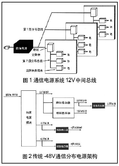 图2示出dc-dc隔离电流模块和POL负载点变换器如何配置成典型的分布电源系统,提供多输出电压和电流。来自前端ac-dc电源的DC电压(-36~-72V)馈入一个隔离的电源模块,此模块代表一个总线变换器。模块完全是隔离ac-dc变换器,有不同的形式(全砖、半砖、1/4砖),具有标准的占位面积,引脚输出和散热能力。POL变换器可以是开关稳压器(降压或升压稳压器)和线性稳压器的组合或仅是线性稳压器,这取决于所供电的电路要求。灵敏电路需要低噪声线性稳压器,而高效率开关稳压器是必须有最小功耗的电源系统的选择。
