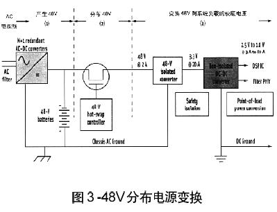 图3示出电信应用的-48V分布电源系统框图,该图说明了电源从输入ac线到低电压dc-dc POL变换器的过程,电池(48V)为电源失效时备份ac-dc变换器。-48V热交换控制器(IC)在带电插拨电路板时,为电源连接提供智能控制,这包括侵入电流控制,短路保护和保护电源系统的其他保护功能。第一个dc-dc变换级是一个隔离变换器,这意味着输入dc电源地与输出ac电源地是隔离的,通常采用变换器隔离,隔离是限定的,防止在失效条件下所呈现危险电压电平危害人。然而,隔离电路使变换器比较贵并对效率有影响。为系统单元电路提供电源的POL变换器不需要隔离,因为它们由为其提供dc输入电源的隔离电源模块保护。