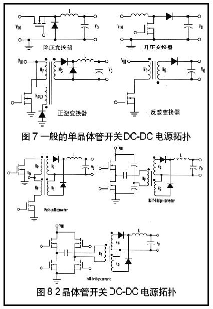 单晶体管拓扑(图7),如降压、升压、正激、反激是在分布系统(高达100W)中设计用于相当低功率负载的dc-dc变换器。降压和升压电路是非隔离的,而正激和反激变换器提供变压器隔离。