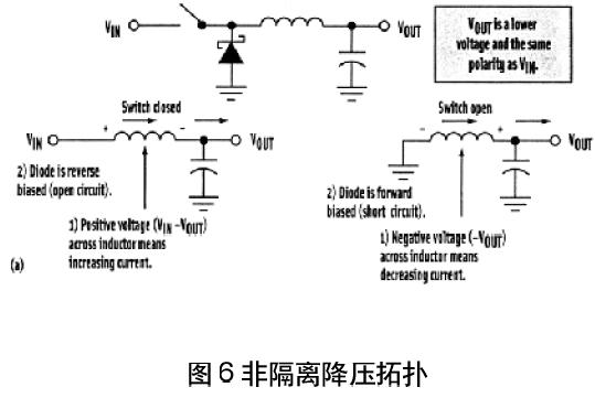 降压变换器是构成大多数开关变换器架构基础的基本拓扑。它是最通用的拓扑,在分布电源系统中会用到这种拓扑,因为必须变换高dc电压(48V)到较低的电压,而且功耗小。开关是一个功率晶体管(通常是MOSFET),其栅极由执行脉宽调制(PWM)的IC驱动它控制占空比(晶体管的开关时间),从而控制输出电压大小。图6示出非隔离降压拓扑。